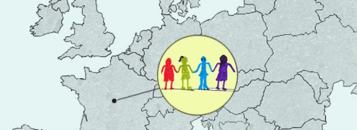 Europakarte mit Selles-sur-Cher in Frankreich. Logo mit Menschenkette