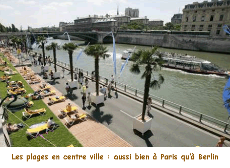 Depuis 2002, tous les ans entre la mi-juillet et la mi-août, on peut aller à la plage à Paris, à Paris Plages. Au bord de la Seine sont installés des bacs à sable, des jets d'eau, une piscine. On peut s'allonger sur des chaises longues, jouer au ballon ou se promener. Il y a des stands où on peut acheter des timbres pour les cartes de vacances, ou acheter des boissons fraîches. On voit des gens qui font de la musique, du théâtre ou qui dansent. Il y a plein d'animations. On peut même se faire bronzer en maillot de bain sur un transat ou tout simplement sur une serviette de bain.