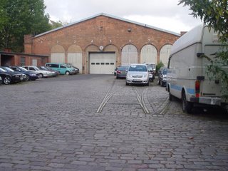 - Ja. Es ist jetzt eine Halle, in der werden von der Polizei sichergestellte Autos aufbewahrt. Also die gestohlen wurden oder die an Unfällen beteiligt waren und die untersucht werden müssen. Früher war es ein Straßenbahn-schuppen. Da fuhren die Straßenbahnen die Straße entlang und blieben nachts in den einzelnen Schuppen, dort wo die Türen sind. Da sind auch noch die Zahlen oben drauf. Da haben die übernachtet sozusagen, wurden nachts abgestellt.