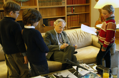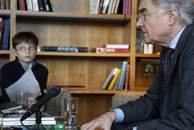 Emil, Clara, Jean-Victor et David ont rencontré l’ambassadeur de France à Berlin, Bernard de Montferrand, dans la bibliothèque de l’ambassade. Il nous a parlé de Berlin. On a aussi voulu évidemment savoir s’il aimait l’école quand il avait notre âge. Eh bien non : « A notre âge, l’ambassadeur n’aimait pas beaucoup l’école, il n’était pas très sage, et même un peu chahuteur. Sa matière préférée, c’était l’histoire parce que c’était vivant, et la géographie parce qu’il adorait dessiner des cartes. Quand il était enfant, l’ambassadeur ne voulait pas du tout devenir ambassadeur, il voulait devenir pilote d’avion, parce qu’on va loin et vite et parce que c’est moderne. Et parce qu’on vole… »