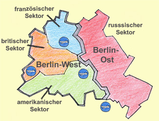 Zone: Deutschland wurde nach dem Zweiten Weltkrieg in vier Zonen aufgeteilt, die jeweils von einer der Siegermächte verwaltet wurden. Berlin lag inmitten der Ostzone, die von der Sowjetunion beherrscht wurde und stand wiederum unter Kontrolle der vier Siegermächte.