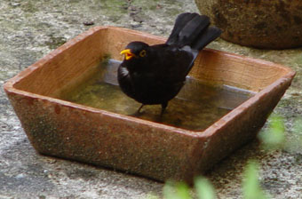 Amsel badetUnser Garten ist klein, aber gut besucht. Hauptgäste sind Spatzen, sie leben gleich hinter dem Zaun. Sie kommen gern zum Baden. Meisen suchen Nahrung, aber baden nicht. Es gibt auch ein Amselpärchen, das Männchen hat eine Schnabel-Fehlstellung.