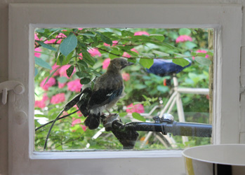 Eichelhäher Baby auf dem Fahrrad vor dem Küchenfenster.