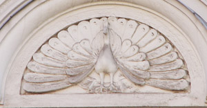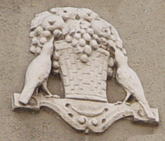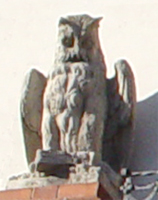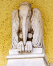 Tauben, Stare oder Drosseln? Hier Eule, Uhu oder Kauz?  Oben auf einer Säule eines Hauseinganges sitzt gebückt der große Vogel. Storch, Strauß, Geier, Pelikan oder Kormoran? Nachts könnte er Angst einjagen. Vielleicht soll er böse Geister verjagen. Er ähnelt einer Schnabelmaske gegen die Pest.
