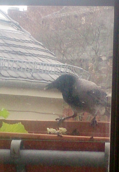 Krähe auf dem BalkonPick, Pick, die Krähe ist wieder da. Kein Wunder, ein Stück Salat liegt für sie da.