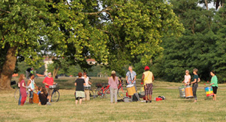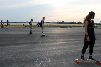 Attendre le coucher du soleil sur le Tempelhofer FeldSur le Tempelhofer Feld, on peut faire toutes sortes de sportsL'ancien aéroport de Tempelhof est devenu depuis 2010 un parc immense et offre ainsi un grand espace de liberté. Les anciens bâtiments sont utilisés pour des fêtes, des festivals, des foires, des événements majeurs ainsi que par des entreprises.