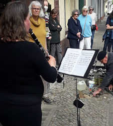 Um die 25 Personen standen um 16h vor dem Haus, Evelyn Hagenah, Initiatorin dieses Stolperstein-Projekts, sprach über den Verlauf der Zeremonie und über das Leben von Frau Pilzer, zwischendurch gab es Musik.