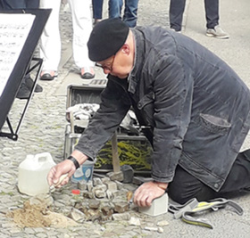 Parallel zur Lesung und zur Musik ging der Steinleger seiner Arbeit nach. Es war interessant zu schauen, wie der Stein verlegt wird. Die Oberfläche aus Messing ist 10 cm × 10 cm groß. Die sehr lange Unterseite ist aus Beton, wie die Wurzel einer Pflanze. Der Steinleger war mehr ein Künstler als ein Handwerker, er war sehr fürsorglich.
