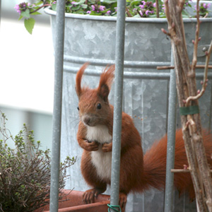 On le croise dans toute la ville, traversant les rues à toute vitesse, passant d’un arbre à l’autre. Ses préférés sont les noisetiers et les chênes à cause de leurs fruits. Il en fait des provisions pour l’hiver. Il les enterre en partie dans des pots de fleurs sur des balcons sans trop se soucier pas des plantes.