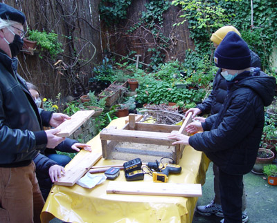 On commence par ajouter quelques planches de bois. On a à peine fixé la première planche que le premier invité arrive : une mouche à la recherche d'un abri pour l'hiver. Cela nous encourage dans notre action, les hôtels pour insectes sont donc recherchés.