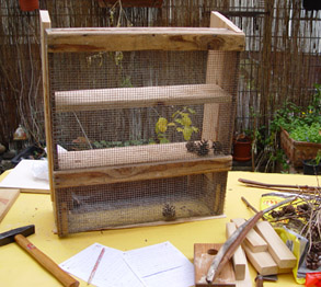 Dann haben wir noch ein paar Bretter besorgt und Füllmaterial für die Inneneinrichtung: Tannenzapfen, kleine Äste, dünne Zweige, grobe Halme. Wir guckten das das Material, das wir gesammelt hatten. Es konnte losgehen.
