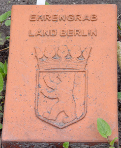 Près de la pierre commémorative se trouve une plaque en terre cuite sur laquelle est écrit : Ehrengrab Land Berlin. Cela signifie que le Land de Berlin rend hommage à ces personnes et entretient leurs tombes. Nous allons en voir encore beaucoup d'autres, il y en a environ 60 ici. La prochaine se trouve juste au coin, sur la tombe du médecin Rudolf Virchow (1821-1902) et une autre un peu plus loin sur la tombe de Friedrich Drake (1805-1882, sculpteur).