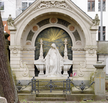 D'autres reposent dans un mausolée avec une chapelle, comme l'entrepreneur en produits laitiers Carl Bolle (1832-1910). Nous en concluons qu'il a fait de bonnes affaires. Un peu plus loin, se trouve la tombe richement décorée de l'ingénieur et fabricant de papier Carl Hofmann (1836-1916). Le tableau derrière la statue représente un soleil doré. Nous trouvons cela joli.