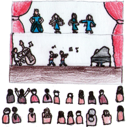 Zurzeit nehmen 50 Personen und 6 Kinder an der Aufführung teil. Es gibt eine sehr gute Stimmung mit den anderen Kindern. Dann werden zwei Aufführungen gefilmt, damit man sie auf Video sehen kann.