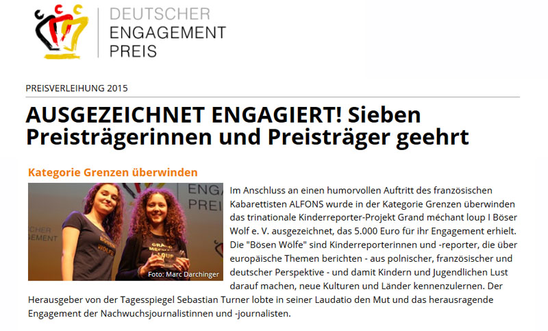 23 millions de personnes s'engagent bénévolement en Allemagne, 500 projets ont été nominés pour le Prix allemand de l'Engagement, 7 lauréats : le Grand méchant loup, projet trinational, reçoit le Prix allemand de l'Engagement dans la catégorie SURMONTER LES FRONTIERES. Nous dédions ce prix à tous les gens qui s'engagent, en particulier à tous ceux qui aident les personnes qui ont dû fuir leur pays. Et nous remercions tous les gens qui ont bien voulu soutenir le Grand méchant loup dès ses débuts pour qu'il vive et continue à s'engager. Un grand merci !