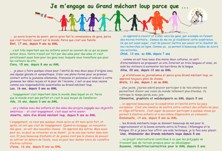 Qui est-ce, au fond, le grand méchant loup ? L'inconnu ? Une langue qu'on ne comprend pas ? Un pays qu'on ne connait pas ? Notre souhait, c'est d'amener le plus d'enfants et de jeunes possible à visiter notre site Internet interactif afin de ne plus avoir peur du "Grand méchant loup", des langues, des cultures étrangères. Apprendre à découvrir l'Europe et le reste du monde en s'amusant, voilà  le but de l'association Grand méchant loup qui travaille étroitement avec le Lycée Français de Berlin. Les enfants et ados parlent sur le site en trois langues de thèmes européens, avec la perpective de la France, de l'Allemagne mais aussi de la Pologne.