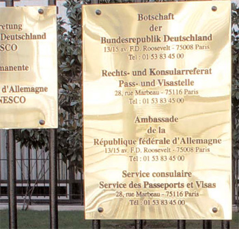 <- Le panneau sur la grille d'entrée de l'ambassade d'Allemagne à Paris