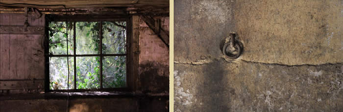 Okno w dawnej stajni Hak z szeklą służący do przywiązywania koni