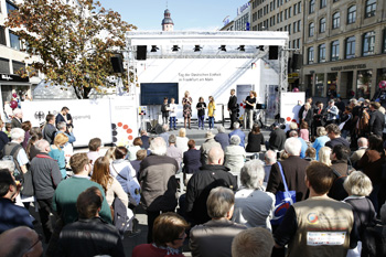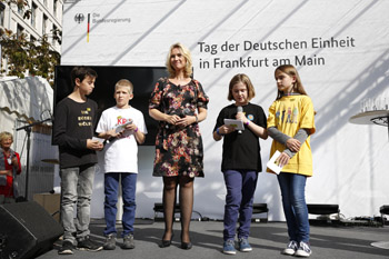 Der 3. Oktober 2015 in Frankfurt-am-Main. Kinderreporter von Seitenstark befragen die Familienministerin Manuela Schwesig zum Tag der Deutschen Einheit.