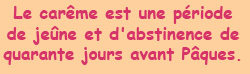 Il existe encore aujourd'hui des gens qui font carême. Cela veut dire que pendant 40 jours, ils changent leurs habitudes et ne mangent plus de viande ou de sucrerie, ou ne boivent plus d'alcool, ne fument plus ou ne jouent plus à des jeux vidéos.