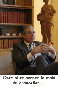 A l’ambassade, on est en relation avec tout le monde : Avec l'Elysée, et avec l'entourage de l'Elysée. Quand le Président de la République vient ici, il me fait monter dans sa voiture et je lui dis quelle est la situation. Evidemment, le Président a déjà beaucoup travaillé avant, il sait déjà tout, mais il veut le dernier éclairage. Ensuite, il y a le Premier ministre qui rencontre des gens du domaine de l'industrie et du domaine économique, et qui verra la Chancelière. Donc, on est en contact avec chacun des membres du gouvernement et aussi avec tous les milieux économiques à Paris.