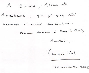 Widmung französische Politikerin Simone Veil - Für David, Alina und Anastasia, ich bin sehr glücklich darüber, euch getroffen zu haben. Viel Glück und alles Gute für alle drei. In Freundschaft, Simone Veil, 30. November 2005 Was meine Enkelkinder angeht, je nachdem. Ich habe noch sehr junge Enkel, ein Mädchen ist gerade erst sechs Jahre alt geworden, also habe ich mit ihm nicht darüber gesprochen. Mit den anderen schon, aber ich rede nur mit ihnen darüber, wenn ich spüre, dass sie das Bedürfnis haben, von mir darüber etwas erfahren zu wollen. Ich spreche besonders über meine Eltern, die durch die Deportation umgekommen sind, damit sie wissen, wer die Großeltern waren, die sie niemals kennen lernen werden. Ich liebte meine Mutter über alles, sie war ein außergewöhnlicher Mensch. Mein Bruder ist verschollen, auch mein Vater, bei der Deportation, und ich will nicht, dass sie vergessen werden. Ich habe mich mit den Deutschen versöhnt, die Deutschen heute sind nicht für die Vergangenheit verantwortlich, aber man darf nicht vergessen, denn gerade wenn man vergisst, was passiert ist, kann es wiederkommen.