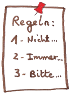 Wenn man Regeln nur so begreift, dass etwas verboten ist, fühlt man sich schnell erdrückt. So einen Eindruck kann man zum Beispiel gewinnen, wenn es zu viele Regeln gibt. Aber Regeln sind etwas ganz Sinnvolles und Nützliches. Es gibt sie überall, ob sie geschrieben sind oder nicht. Überlegt mal, in einer Familie gibt es auch Regeln, die nicht festgehalten sind. Da steht nicht „Paragraph eins“, und doch geht man nach Regeln vor und lässt sich von Regeln leiten: Wie man miteinander umgeht, was man glaubt, jemandem zumuten zu können oder was völlig falsch ist.