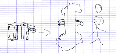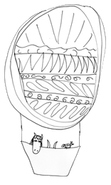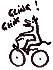 En fait le vélo. Je trouve ça génial et à chaque fois que je prends mon vélo, je me dis : « Que quelqu'un est eu l'idée de mettre deux roues comme ça, et une selle. Ça ne pollue pas, c'est pratique, ça fait faire du sport ! » La roue, ça aussi c'est une invention géniale. Et je ne sais pas si vous avez vu les premiers vélos : ils ont une selle si haute qu'ils ressemblent à des girafes. dessin de Corinne Douarre