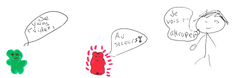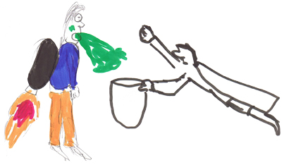 Une machine pour voler, mais ça rend malade celui qui l'utilise et ça le fait vomir. Alors, du coup, j'invente aussi un super-héros pour l'aider. Deux inventions en une fois ! ->