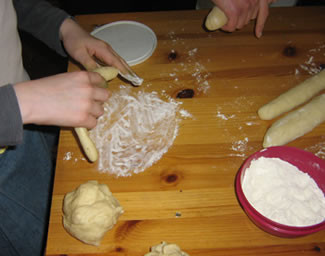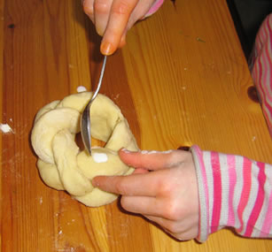 2) Maintenant, on forme une tresse avec les boudins de pâte. On joint les deux bouts de la tresse pour faire un petit nid et on le badigeonne avec du lait.