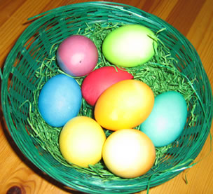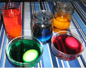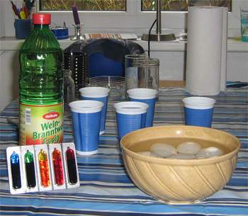 1) On utilise des oeufs durs (temps de cuisson environ 10 mn) et un colorant alimentaire spécial. On trouve ce colorant dans tous les supermarchés allemands avant Pâques. Il faut en plus : des gobelets en plastique ou des vieux verres et du vinaigre de vin.