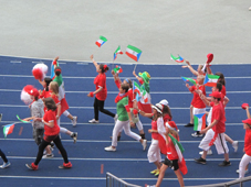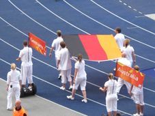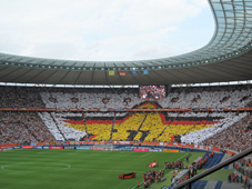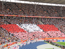 Nun bilden die Zuschauer durch hochgehaltene, farbige Tücher die deutsche und die kanadische Flagge. Für Sicherheit wird auch überall gesorgt.