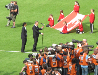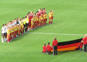 Le match approche : les joueuses chantent l'hymne nationnal de leur pays respectif. Steffi Jones, la Présidente du comité d'organisation de la Coupe du monde et le Président allemand Christian Wullf inaugurent le Mondial 2011.