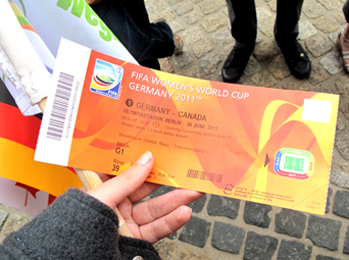 Zwei Jungreporter der Bösen Wölfe sind mit der Organisation TERRE DES FEMMES zum Berliner Olympiastadion geradelt. Und hier ist die Zauberkarte, das Ticket für die Eröffnungsfeier und das erste Spiel: Deutschland gegen Kanada.