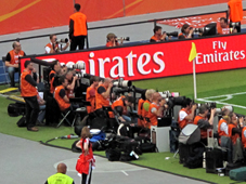 De nombreux photographes suivent le match. Dans la deuxième mi-temps, le suspens monte. Les Canadiennes marquent un but, les fans allemands s'inquiètent. Parmi eux, on trouve aussi beaucoup d'hommes.