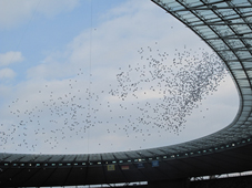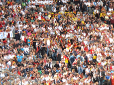 Die Fans strömen ins Stadion und drinnen ist es wahnsinnig voll. Ein Riesenball steht auf dem Spielfeld.