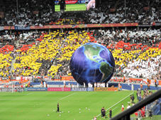 Les fans de l'équipe allemande rentrent en masse dans le stade qui affiche complet. Sur le terrain, un énorme ballon représente le monde entier.