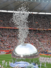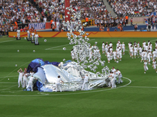Aus dem Riesenball steigen dann tausende Luftballons, die wie Fußbälle aussehen, in den Himmel auf.