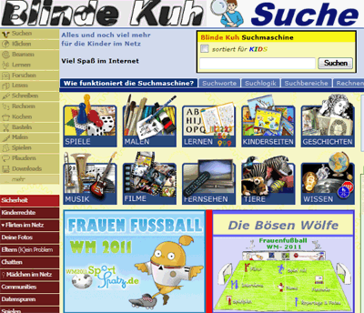 Die Homepage der Bösen Wölfe als Internet-Tipp auf der Startseite der Kindersuchmaschine für Kinder "Blinde Kuh"