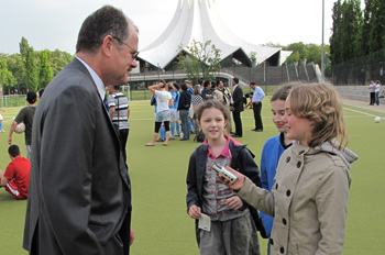 Eigentlich hatte Theo Zwanziger es ganz eilig und keine Zeit für ein Interview, aber die Kinderreporter der Bösen Wölfe konnten ihn dazu erweichen und konnten beim Treppensteigen ein sportliches Interview führen!