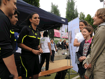 Anja Mittag (en bleu), joueuse de l'équipe d'Allemagne et championne du monde en 2007 et Anna Felicitas Sarholz, meilleur espoir de 2010, en compagnie des reporters du Grand méchant loup. Elles sont toutes les deux très contentes d'avoir pu faire de leur passion un métier.