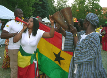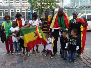 Die Stimmung steigt auch bei den Fans der Ghanaer: hier vor dem Eingang des Nordrhein-Westfälischen Vertretung in Berlin.