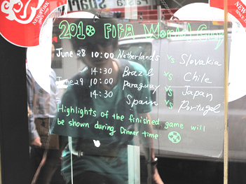 Malgré cela, l'ambiance ne manque pas : nous tenons tête aux autres, soutenant que nous allons gagner 1:0. C'est seulement lorsque le premier but du Mexique a été marqué que nous nous sommes littéralement faits blamer. Ensuite, le Mexique marque un pénalty, nous abandonnons le faible espoir qu'il nous restait de faire ne serait-ce seulement match nul.