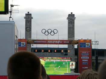 Am Olympiastadion befindet sich die größte Fanmeile Berlins. Und wir - sieben Mädchen - sind dabei...
