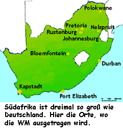 und Durban liegt mehr im Norden, das heißt näher am Äquator. Die Winter sind sonnig und trocken und der Sommer ist ganz feucht und drückend und nass. Also die Winter dort sind so, wie wir uns einen schönen Sommertag vorstellen. 25°, der Himmel ist blau und die Sonne scheint. Deshalb hat Durban von allen zehn Städten der WM das beste Wetter.