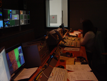 Von der Kulisse ging es weiter in die Regie, einen dunklen Raum mit vielen Fernsehern und Bildschirmen. Hier werden die Aufnahmen der Kameras zu einer Sendung zusammengeschnitten.