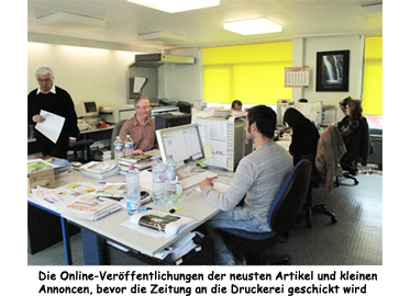 16 Personen, inklusive der Verkaufsabteilung. Ich bin der Chefredakteur und habe ein Team von vier Journalisten, außerdem überall ein paar Korrespondenten. Es gibt außerdem einen Versandservice und -handel und die Auslieferer. Weil die Zeitung gratis ist, stellen wir sie den Geschäften großer Einkaufspassagen zu, das heißt den Bäckereien, den Metzgereien, den Großsupermärkten, wo die Zeitung ausgelegt wird und die Leute sie nehmen. Die 52 000 Exemplare sind nach zwei Tagen vergriffen, danach gibt es keine mehr. Die Leute warten auf sie. Sie hat sich wirklich etabliert.