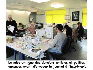 16 personnes, y compris le service commercial. Je suis rédacteur en chef et j'ai une équipe de quatre journalistes, plus des correspondants un petit peu partout. Il y a aussi un service d'expédition et de vente par correspondance, et les distributeurs. Comme on est gratuit, on a une distribution dans les commerces de grand passage, c'est-à-dire les boulangeries, les charcuteries, les grandes surfaces, où le journal est déposé et où les gens le prennent. Les 52 000 exemplaires sont pris en deux jours, après, il n'y en a plus. Les gens l'attendent. C'est donc devenu une institution.
