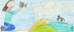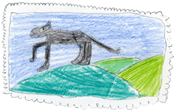 Das ist Wotan. Er ist schön, das heißt also, dass es ihm gut geht. Was mich besonders beeindruckt hat, ist, dass diese Wölfe, vor allem Wotan aber auch Leila und die anderen, sehr groß sind. Ich hatte schon mal Wölfe gesehen, aber nie so, dass ein Wolf an mir hoch gesprungen ist. Wenn Wotan einem seine Vorderbeine auf die Schultern legt und sich aufrichtet, dann ist er sehr groß. Er hat mir mindestens zwei Minuten lang das Gesicht geleckt. Als ich so alt war wie ihr, da hatte ich immer Angst vor Wölfen, ich dachte, es seien bestimmt böse Bestien, die Menschen angreifen. So hat sich Wotan gar nicht verhalten. Er war sehr lieb.